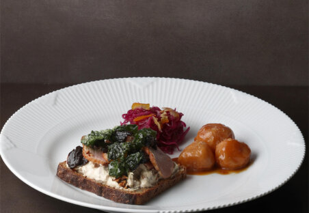 A holiday-season plate featuring Denmark’s classic smørrebrød, generously topped with tender duck. The rich flavor pairs beautifully with toasted rye bread, while warm brown potatoes offer a gentle sweetness and soft texture. Pickled red cabbage adds a bright, refreshing acidity, bringing balance to the dish. Enjoy a winter-only plate that highlights Nordic character and the individuality of each ingredient.