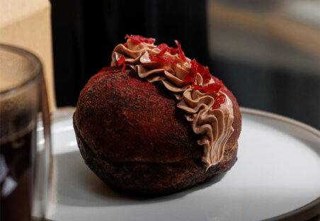 Our popular NOMU donut returns in a seasonal edition. Light, airy dough is topped with chocolate whipped cream, complemented by warm spices such as cinnamon and nutmeg. The refined sweetness and comforting depth make it an ideal pairing with our café drinks—and a charming treat for holiday gifting.
